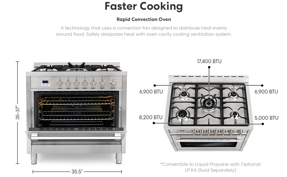 【Appliances】36 in. Gas Range with 5 Burner Cooktop, 3.8 cu. ft. Capacity Rapid Convection Oven with 5 Functions
